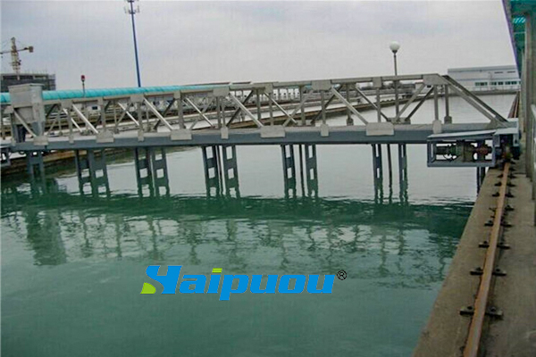 本設備由四點支撐行走大梁橫跨在平流式沉淀池上,雙邊驅動,池兩邊均鋪設鋼軌,從池的一端運行到池子的另一端,邊行走邊吸泥,撞到行程控制,折返行走,回程吸泥,完成一個工作周期。